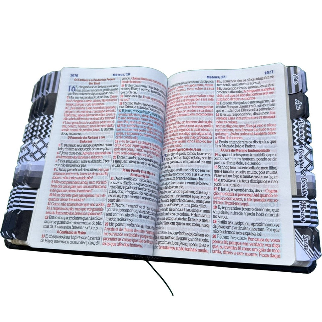• 📑 Abas Adesivas Inclusas: Organização e praticidade para localizar os livros da Bíblia com muito mais rapidez.